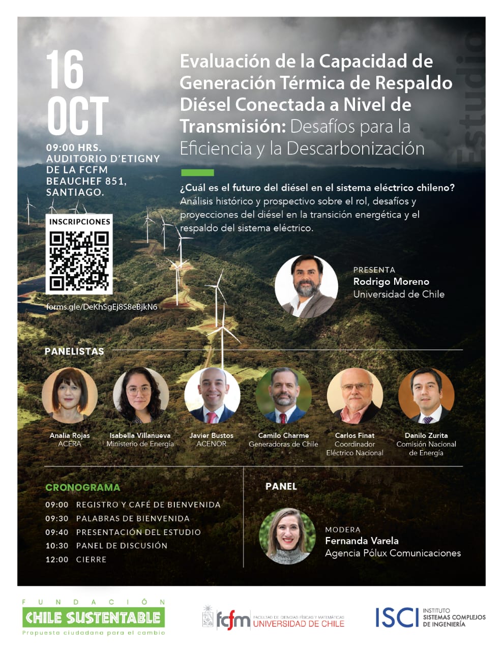 Tenemos el agrado de invitarles al lanzamiento del estudio “Evaluación de la Capacidad de Generación Térmica de Respaldo Diésel Conectada a Nivel de Transmisión: Desafíos para la Eficiencia y la Descarbonización”, desarrollado por Chile Sustentable y Instituto Sistemas Complejos de Ingeniería.