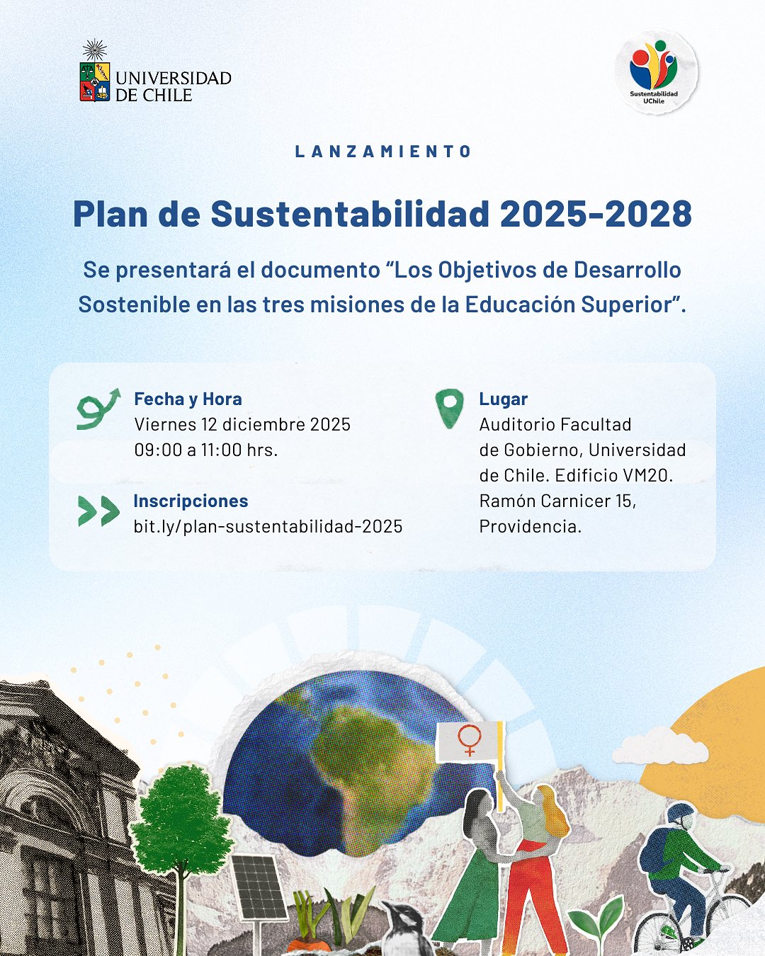 El Comité por la Sustentabilidad de la Universidad de Chile invita a toda la comunidad universitaria al lanzamiento del Plan de Sustentabilidad 2025–2028 y a la presentación del documento de trabajo “Los Objetivos de Desarrollo Sostenible en las tres misiones de la Educación Superior: Diálogos desde la Universidad de Chile”.